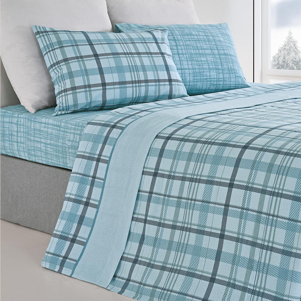 Dê um toque de conforto e estilo ao seu quarto com este jogo de lençóis em flanela com estampado xadrez, feito em 100% algodão.